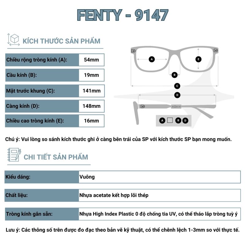 - Kích thước: Mặt trước khung 141mm, càng kính 148mm, chiều rộng mắt kính 54mm, chiều cao mắt kính 16mm, cầu kính 19mm