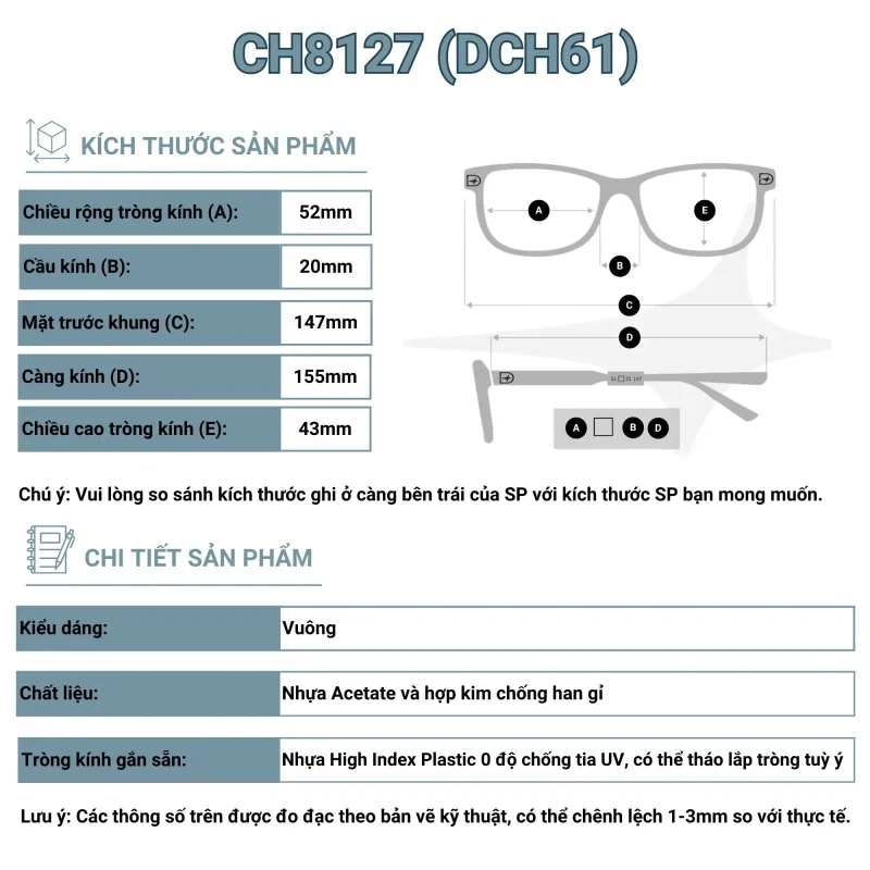 • Kích thước: Mặt trước khung 147mm, càng kính 155mm, chiều rộng mắt kính 52mm, chiều cao mắt kính 43mm, cầu kính 20mm