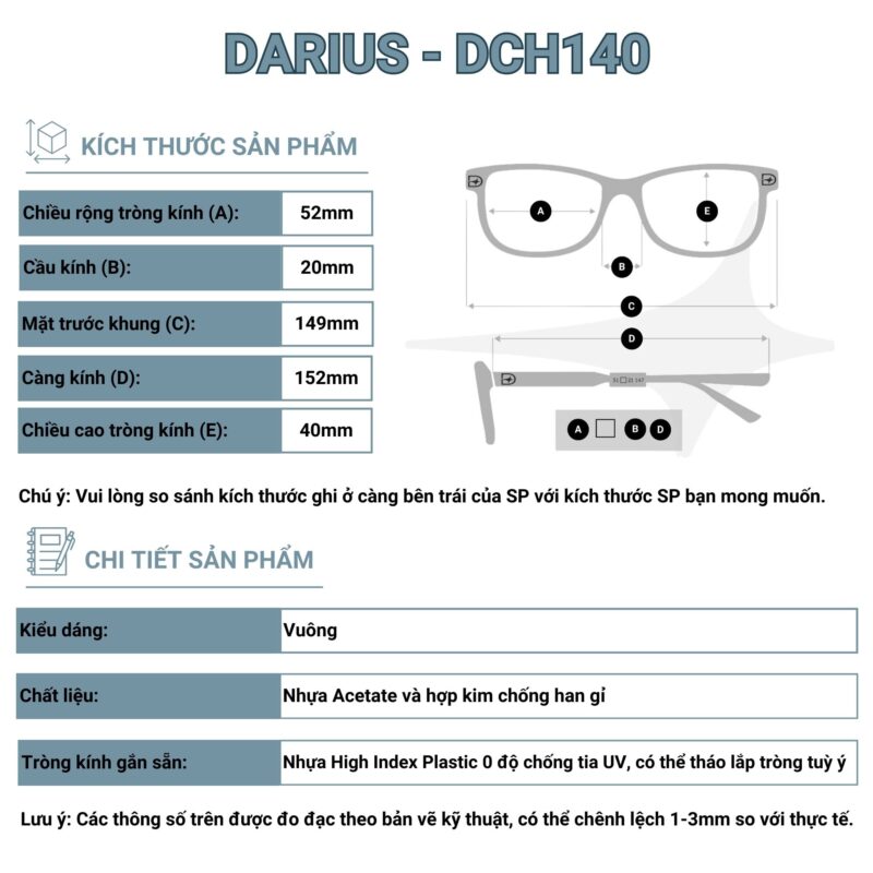 - Kích thước: Mặt trước khung 149mm, càng kính 152mm, chiều rộng mắt kính 52mm, chiều cao mắt kính 40mm, cầu kính 20mm