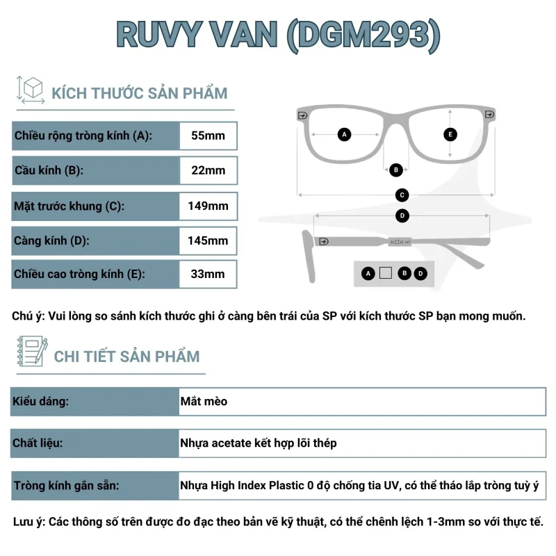 - Kích thước: Mặt trước khung 149mm, Càng kính 145mm, Chiều rộng mắt kính 55mm, Chiều cao mắt kính 33mm, Cầu kính: 22mm