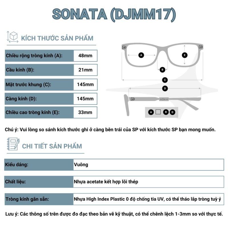 - Kích thước: Mặt trước khung 145mm, càng kính 145mm, chiều rộng mắt kính 48mm, chiều cao mắt kính 33mm, cầu kính 21mm